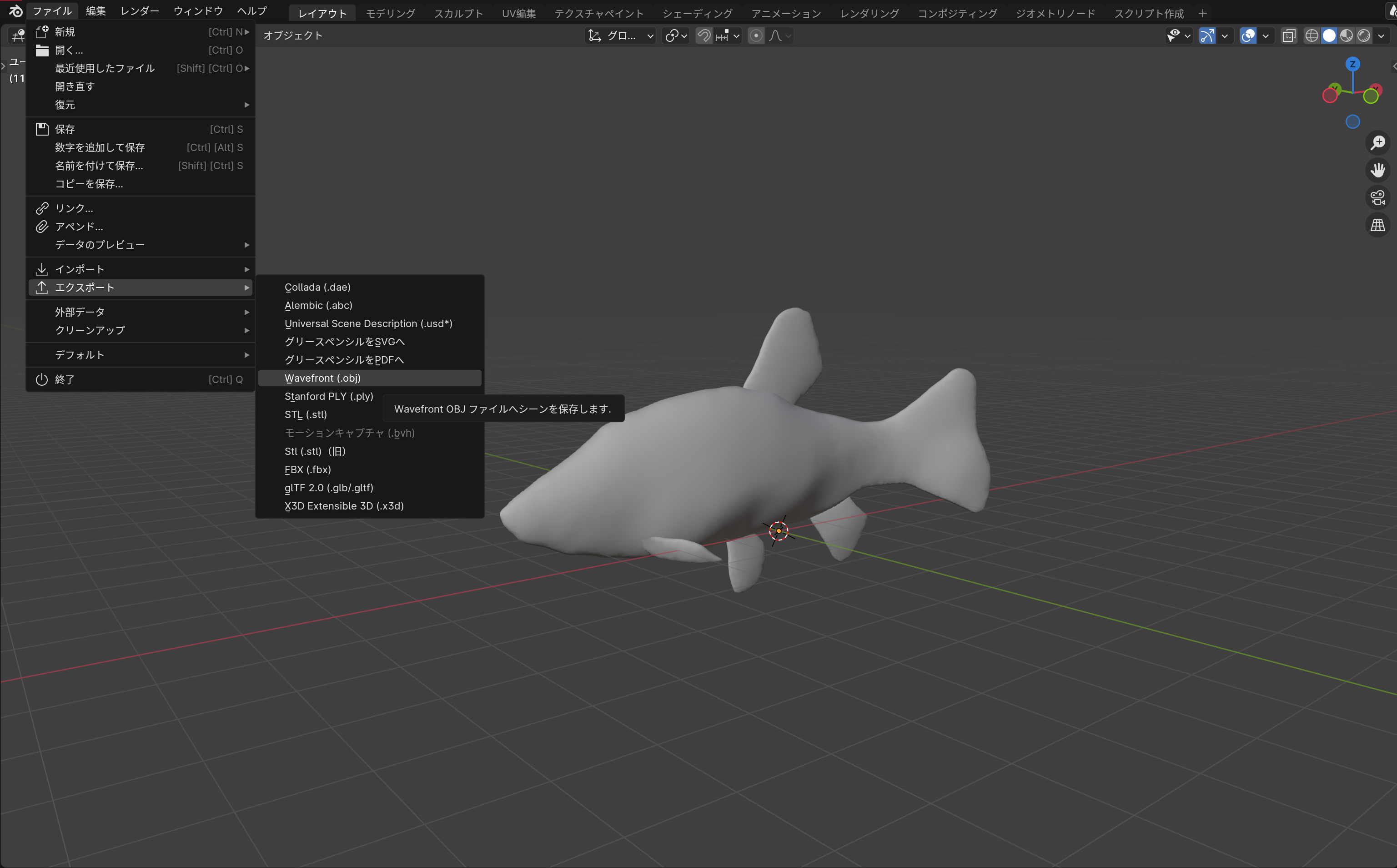 まずはBlenderで好きな3Dモデルを作成し、それを.obj形式でエクスポートします。Blenderのメニューから「ファイル」→「エクスポート」→「.obj」を選択して保存します。