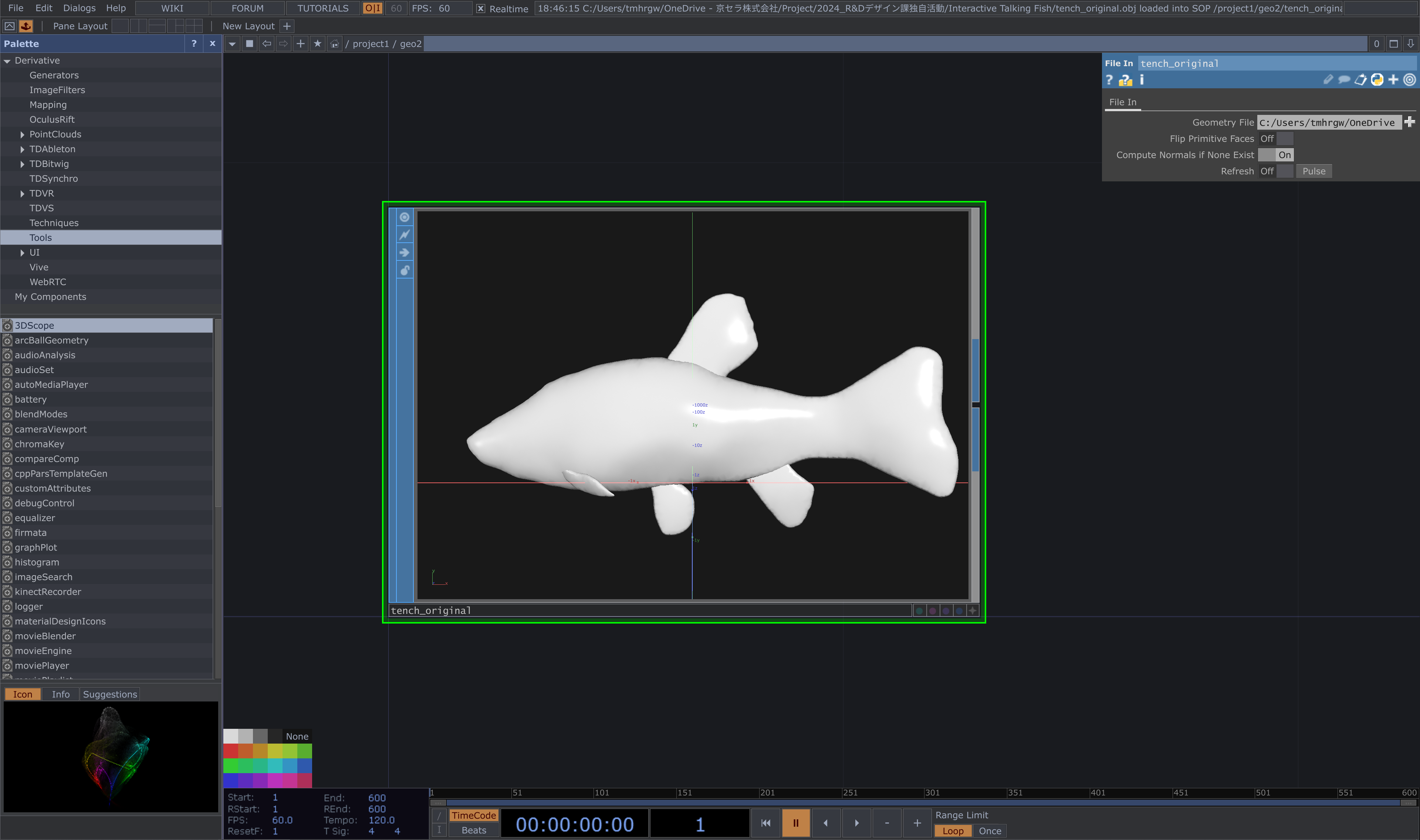 次に、Blenderでエクスポートした.objデータをTouch Designerのネットワークエディターにドラッグ&ドロップします。これで、Touch Designer内にBlenderのモデルが取り込まれます。