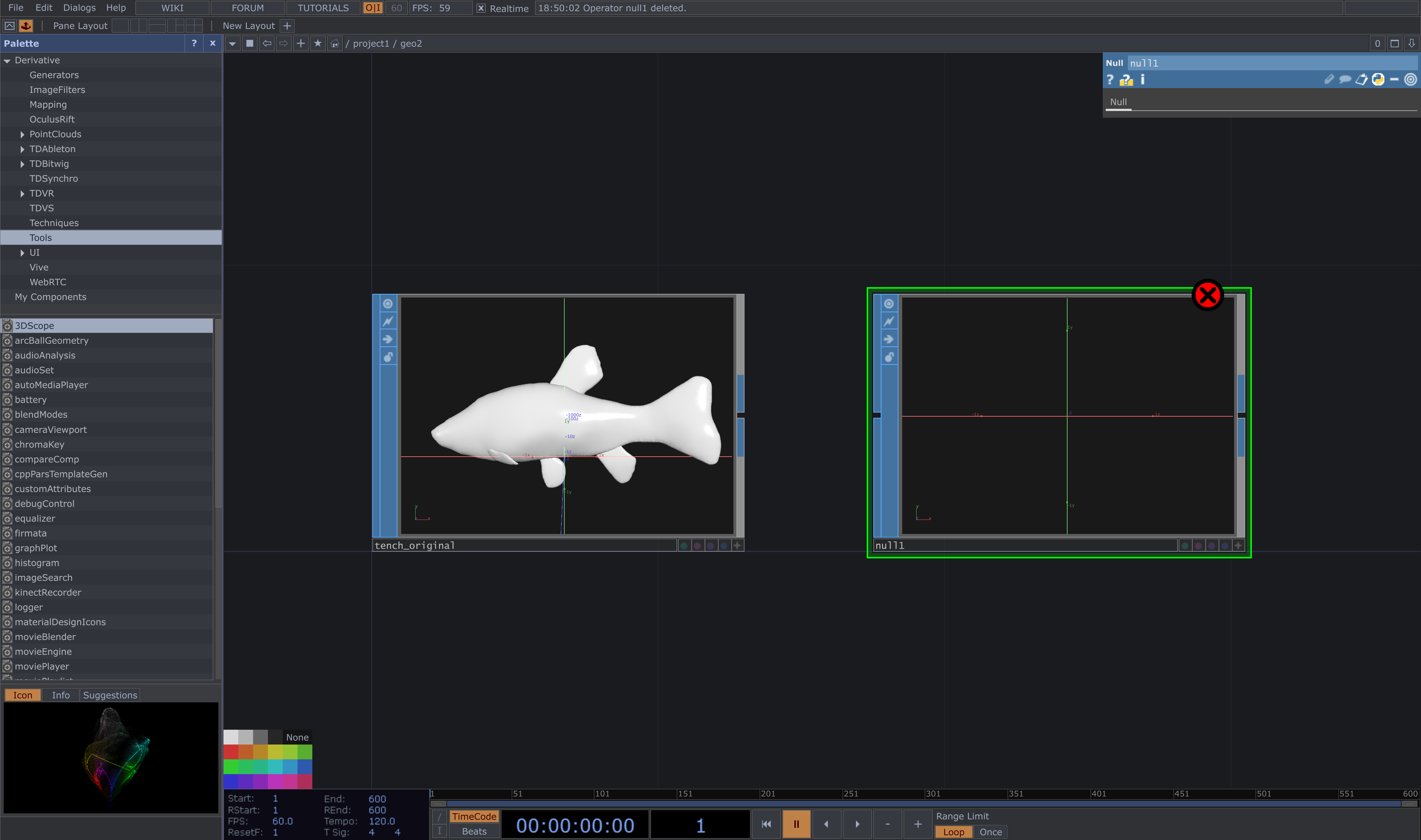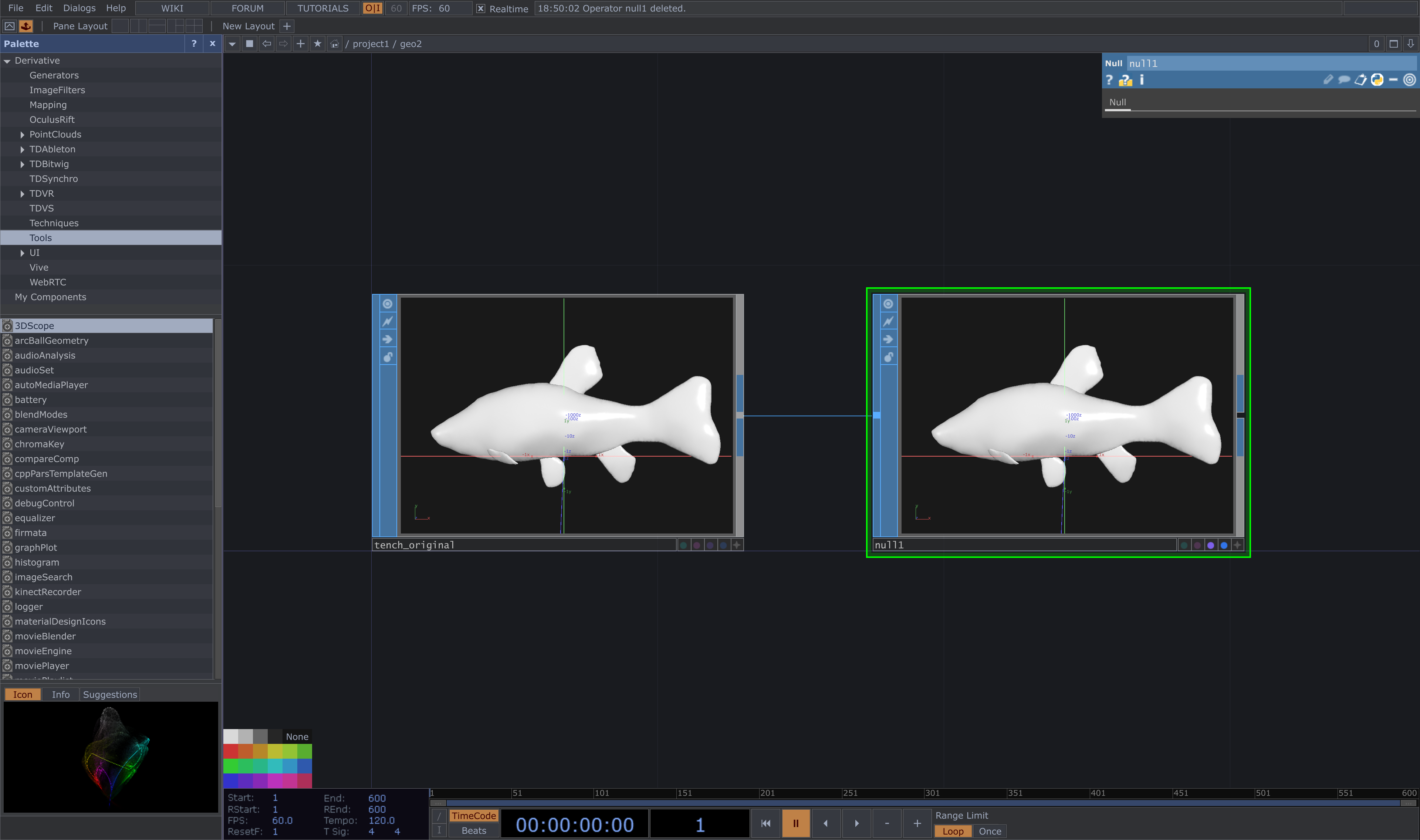 最後に、ネットワークエディターをズームアウトして1つ階層を上がると、GeometryCOMPが完成しています。このCOMPの中にBlenderからインポートした3Dモデルが含まれており、Touch Designer内で自由に操作・レンダリングできる状態になっています。