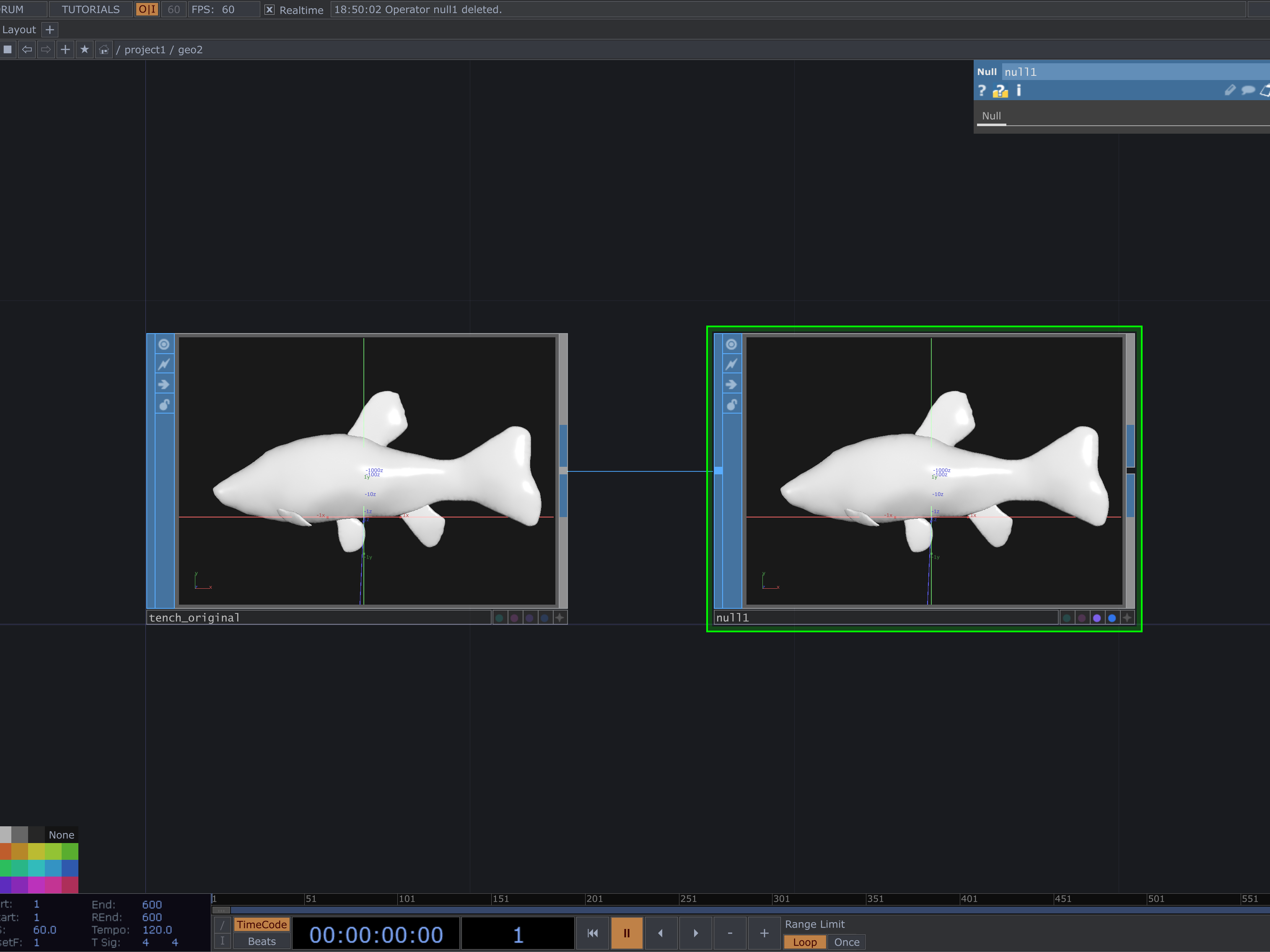 Null SOPに青色のDisplayフラグと紫色のRenderフラグがあります。この2つを有効にすることで、モデルが表示され、レンダリング対象にもなります。フラグをオンにするには、ノードの横にある小さな青色(Display)と紫色(Render)の点をクリックします。